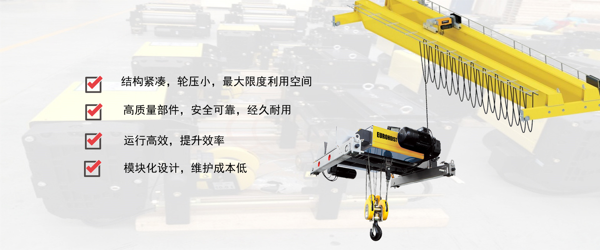 密歇爾起重機械(杭州)有限公司提供全面的起重輸送產品和服務,產品覆蓋環鏈電動葫蘆(125Kg-80T),歐式鋼絲繩葫蘆,防爆葫蘆,懸臂吊,KBK柔性起重機,歐式起重機,起重馬達,端梁,起重移動供電系統等,在國內外被廣泛的應用于生產車間,汽車,模具,機械制造,鐵路,船舶,物流搬運,現代化工廠流水線等工業及其它特殊用途。